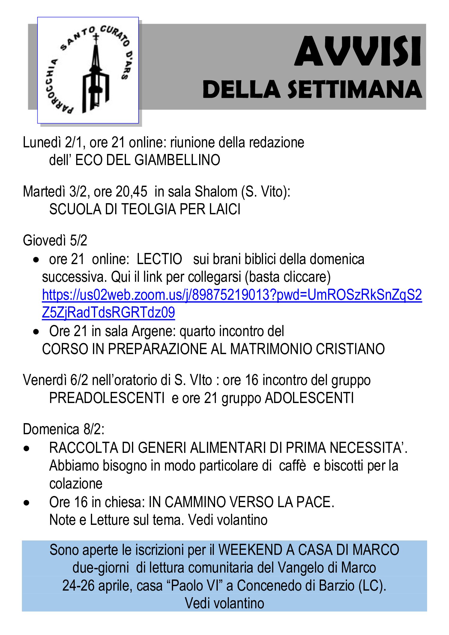 clicca sul titolo e poi sul link che segue per leggere le letture e i commenti della IV DOMENICA DOPO L’EPIFANIA Ricordiamo ogni GIOVEDI alle ore 21 da qui in diretta la LECTIO Argomento:...