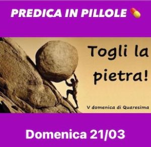 Signore, TOGLI LA PIETRA che rende bui i nostri occhi e che ci impedisce di vedere che “questa malattia non è per la morte”, che c’è una lezione che possiamo imparare da questa pandemia: e cioè che ci si salva solo insieme, che c’è un mondo che va cambiato, che il modello di sviluppo (fondato sui consumi) non funziona, che il nostro stile di vita deve cambiare, che ci sono delle domande di fondo che non possiamo più eludere….. Signore, togli dalla nostra vita e dalla nostra società la pietra dell’egoismo che ci porta a pensare prima a noi (o solo a noi) e ci impedisce di pensarci e di vederci come comunità.