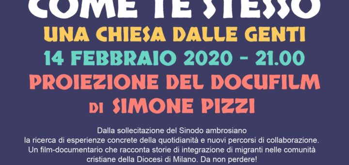 Come te stesso 14 febbraio 2020 – 21.00 Proiezione del docufilm di Simone Pizzi Seguirà dibattito Parrocchia Santo Cutato d’Ars Largo Giambellino, 127 – Milano